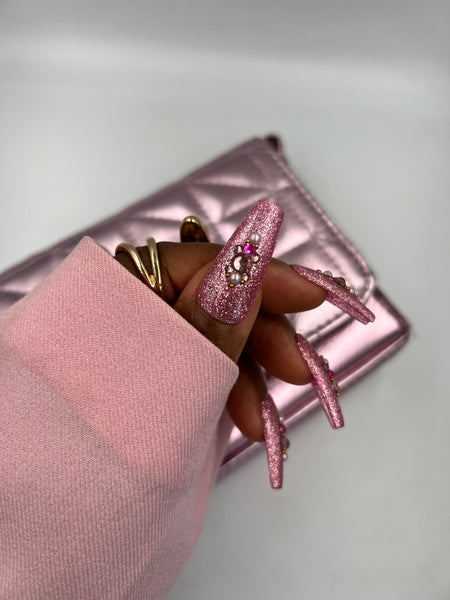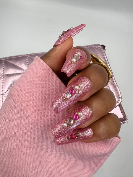 A glam set with a gliterry nail base and crystal and pearl accents.